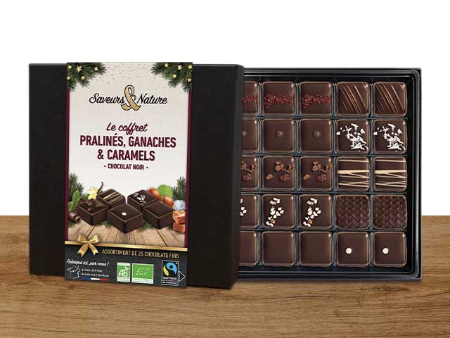 Coffret assortiment de 16 chocolats noirs fourrés aux caramels