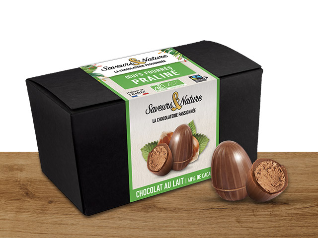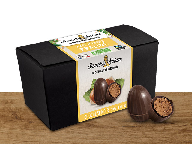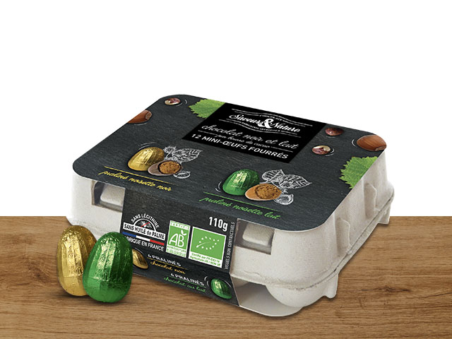 Boite de 12 petits œufs praliné noisette enrobés de chocolat noir et lait