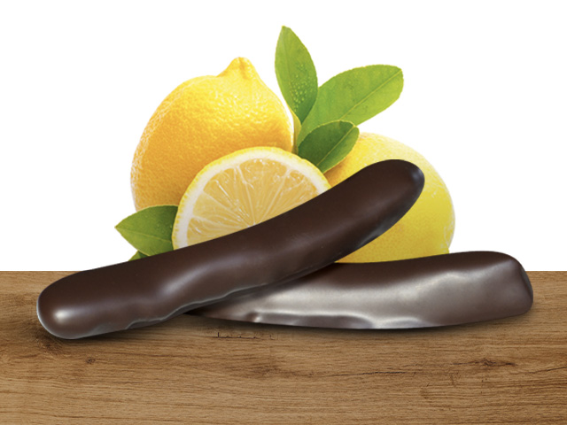 Ecorces de citron confites enrobées de chocolat noir à 70% de cacao minimum