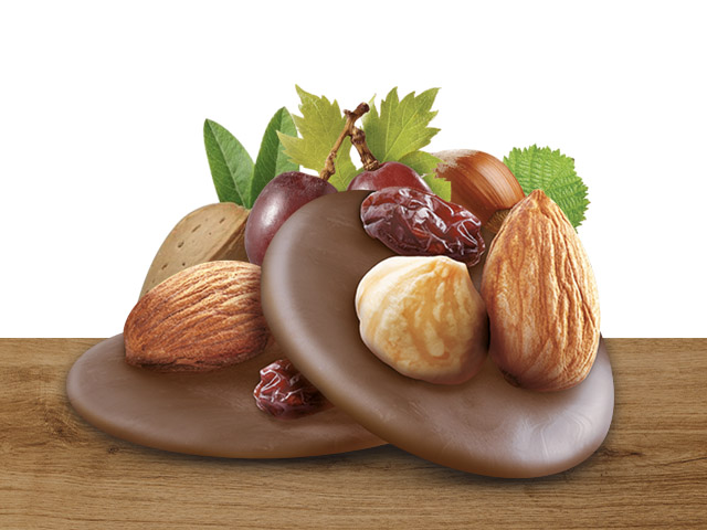 Chocolat au lait à 40% de cacao minimum, agrémenté d’amandes, de noisettes et de raisins secs