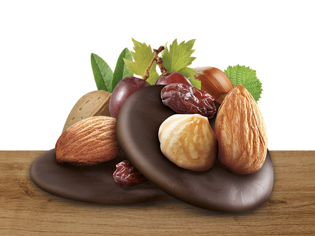 Chocolat noir à 70% de cacao minimum, agrémenté d’amandes, de noisettes et de raisins secs