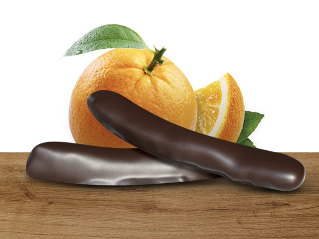 Ecorces d’orange confites enrobées de chocolat noir à 70% de cacao minimum