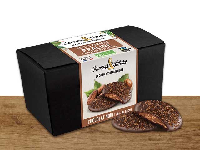 Palets de chocolat noir 70% de cacao minimum fourrés au praliné noisette et décorés de copeaux de fèves de cacaoIngrédients : chocolat noir* (pâte de cacao*, sucre de canne*, beurre de cacao*), praliné NOISETTE* : 26% (NOISETTES* : 13%, sucre de canne*), copeaux de fèves de cacao torréfiées* : 7%, chocolat au LAIT* (sucre de canne*, beurre de cacao*, poudre de LAIT entier*, pâte de cacao*). Peut contenir des traces de gluten, d’œuf, d’arachides, d’autres fruits à coque et de sésame.*Ingrédients issus de l’agriculture biologique.Cacao et sucre : le bilan de masse est utilisé pour correspondre au volume acheté aux conditions Fairtrade/Max Havelaar. 86% du poids total.