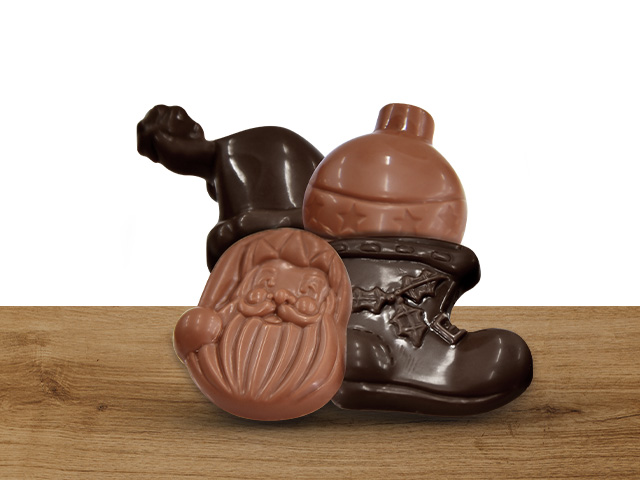 Découvrez nos figurines de Noël au chocolat noir et chocolat au lait. Un format idéal pour partager au moment des fêtes ou à distribuer dans les assiettes de vos convives pour une jolie table de fêtes !