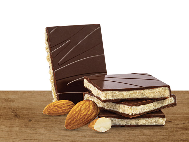 Ingrédients : Chocolat noir* 58% cacao minimum (pâte de cacao*, sucre de canne*, beurre de cacao*), fourrage : 46% (sucre de canne*, AMANDE* : 30%, pâte d’AMANDE* :